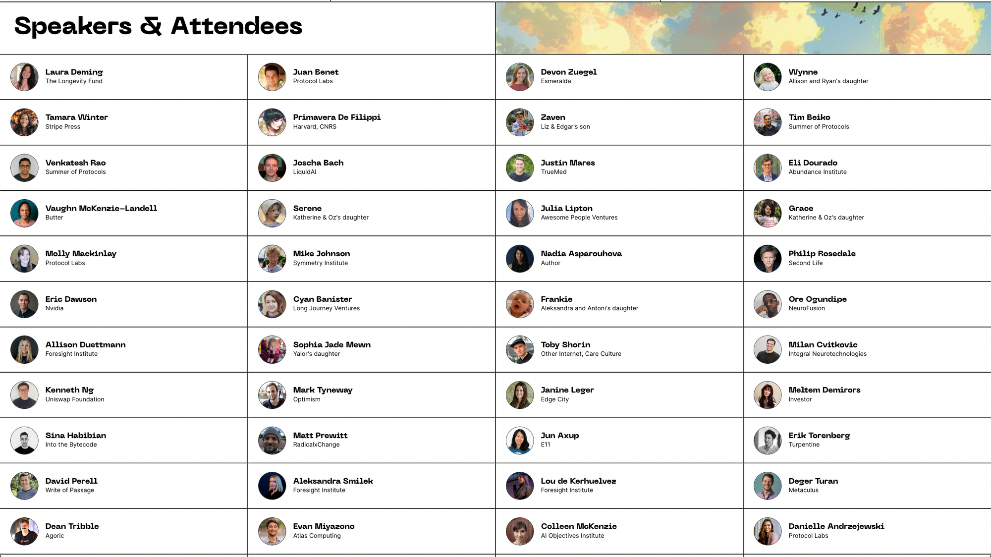By focusing more narrowly, Vitalia was able to attract an aligned audience and go deeper on longevity: a biohacking lab, workout groups, healthy food, cold plunges, a biomedical hackathon, and relevant speakers like Bryan Johnson and Aubrey de Grey.