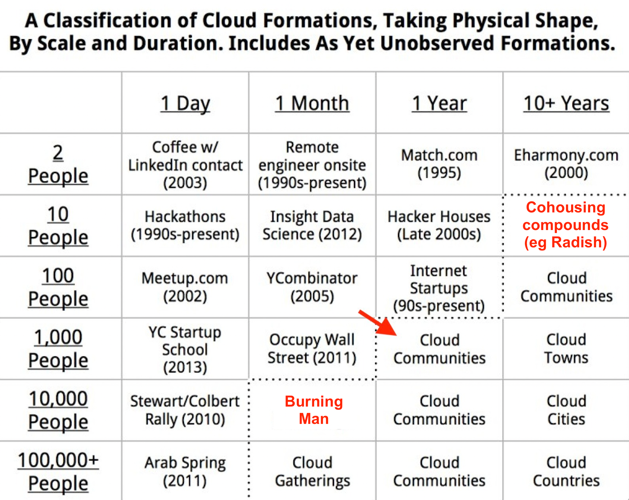 A decade ago, Balaji shared this classification of cloud formations, which charts form factors for network societies by scale and duration. The dotted line indicates the frontier of "unobserved formations". I've added a red arrow to indicate where popup villages are pushing out the frontier: